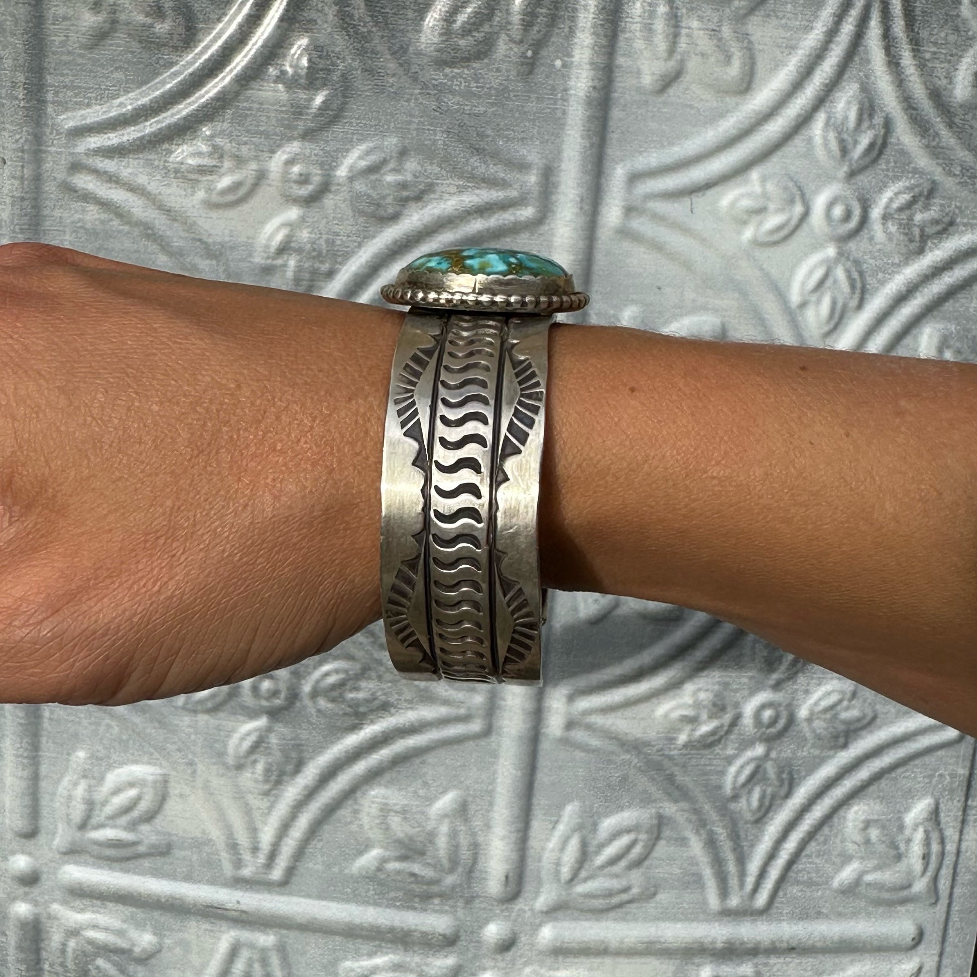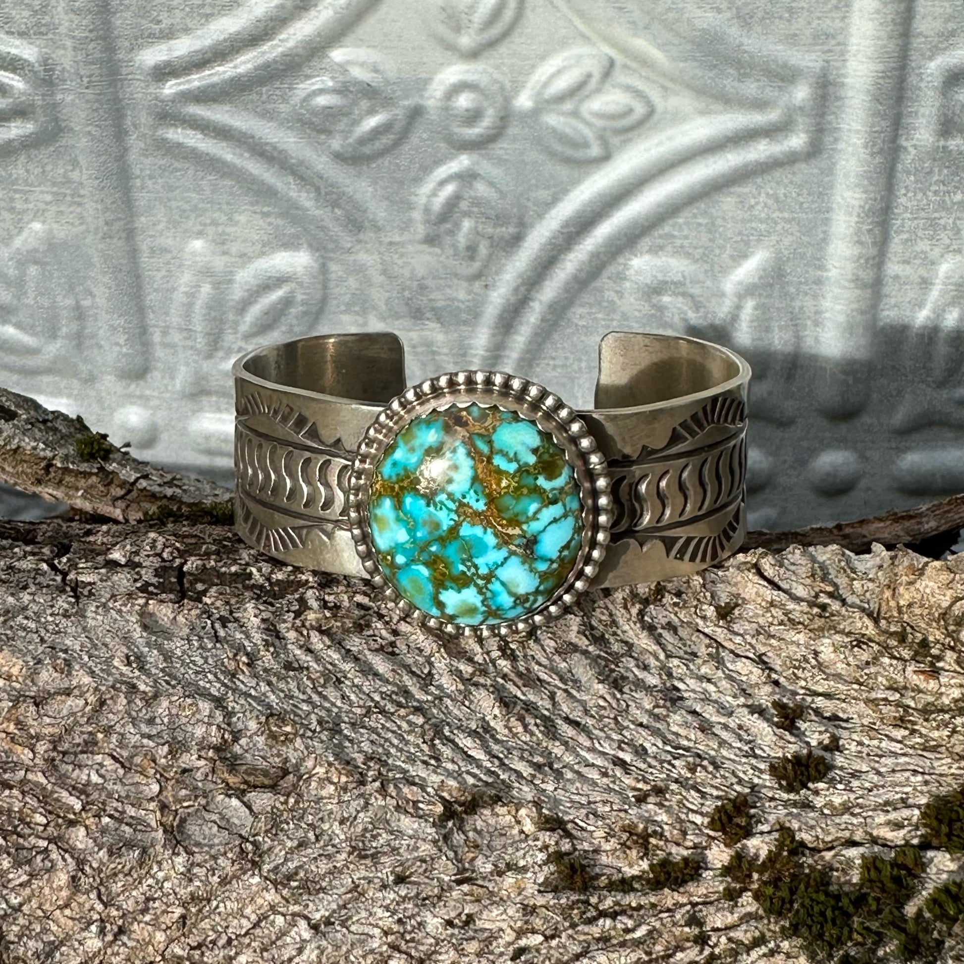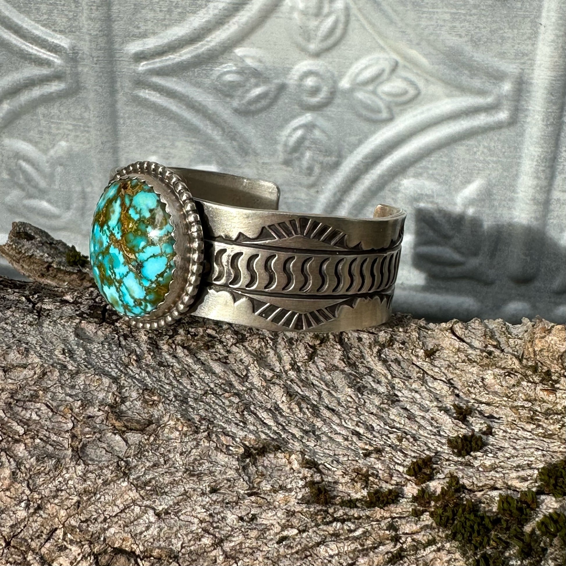 Incredible matrix in this modern made Turquoise Mountain cuff bracelet. Signed by Navajo artist, Rick Enriquez. Inner circumference measures 5 5/8in end to end with a 1in gap. Cuff measures 7/8in wide, stone face is approximately 1.25in, weighs 62g.