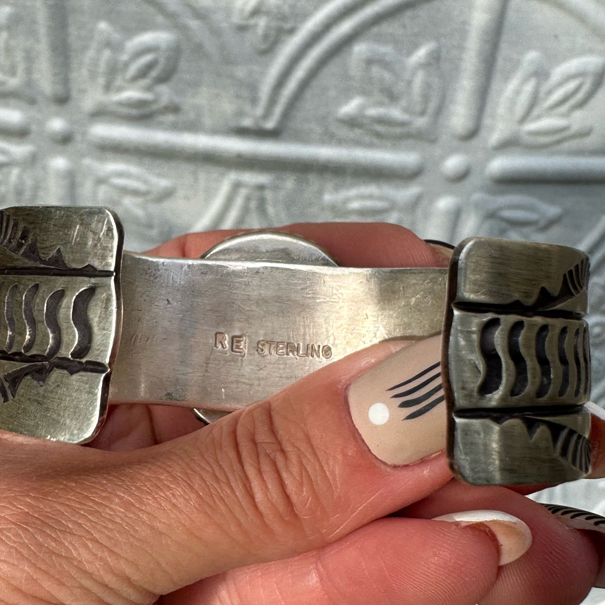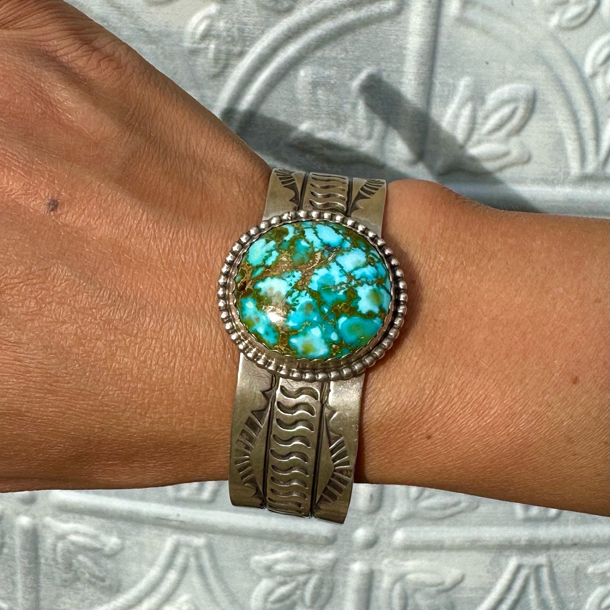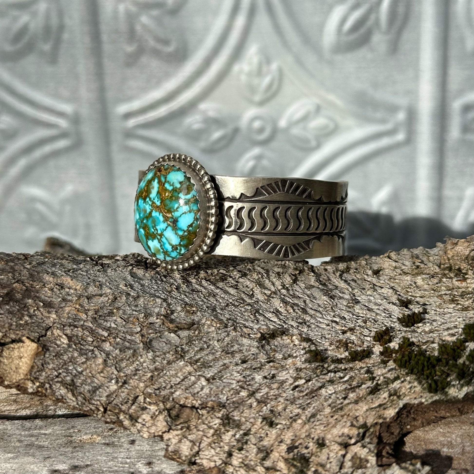 Incredible matrix in this modern made Turquoise Mountain cuff bracelet. Signed by Navajo artist, Rick Enriquez. Inner circumference measures 5 5/8in end to end with a 1in gap. Cuff measures 7/8in wide, stone face is approximately 1.25in, weighs 62g.